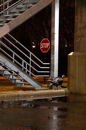 this poor gobbler was trying to stay dry in the parking garage before i disturbed him with my camera.